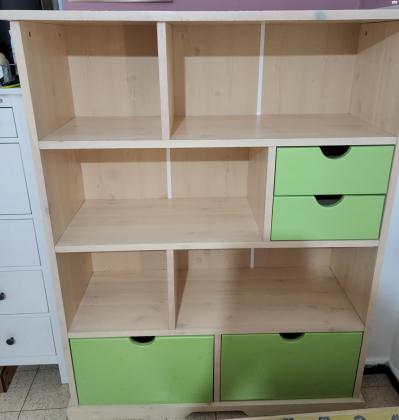כוננית עומדת דגם "רוני" של חברת "עצמל'ה". עשויה מעץ מלא בשילוב mdf. כוללת חמישה תאים וארבע מגירות בצבע ירוק בהיר.הכוננית במצב טוב מאוד.גודל: רוחב 120, גובה 152, עומק 40.לא מפורקת!!איסוף מצפון תל אביב כוננית עם תאים ומגירות
