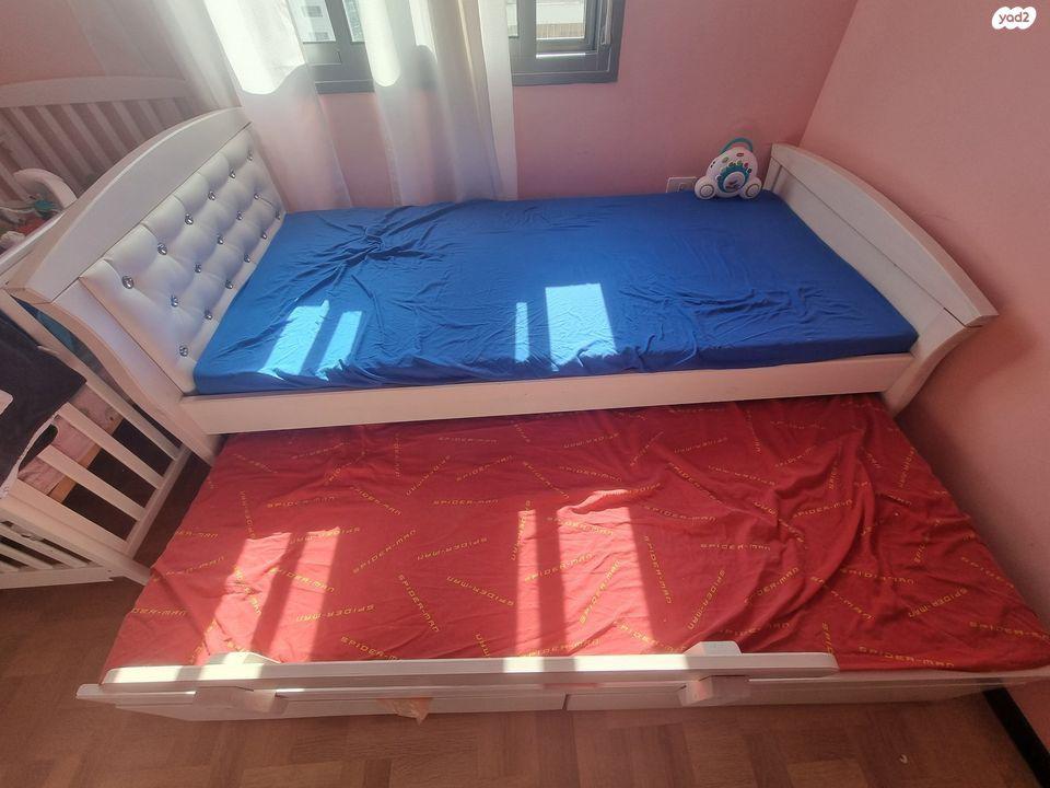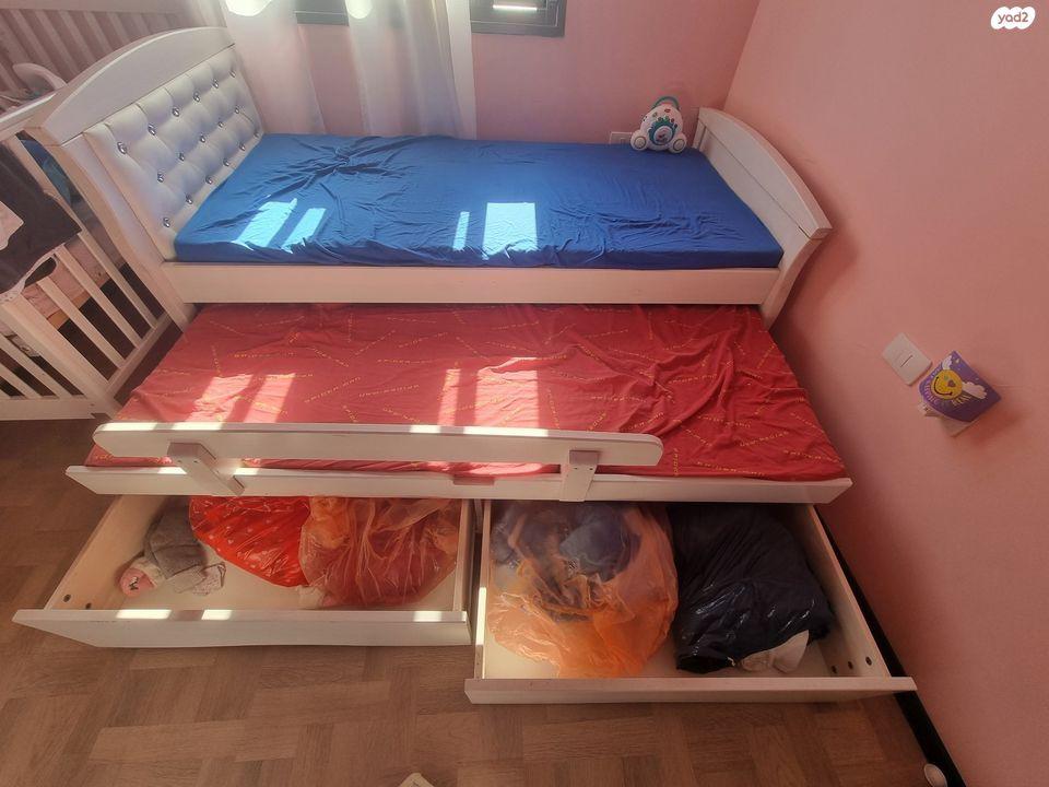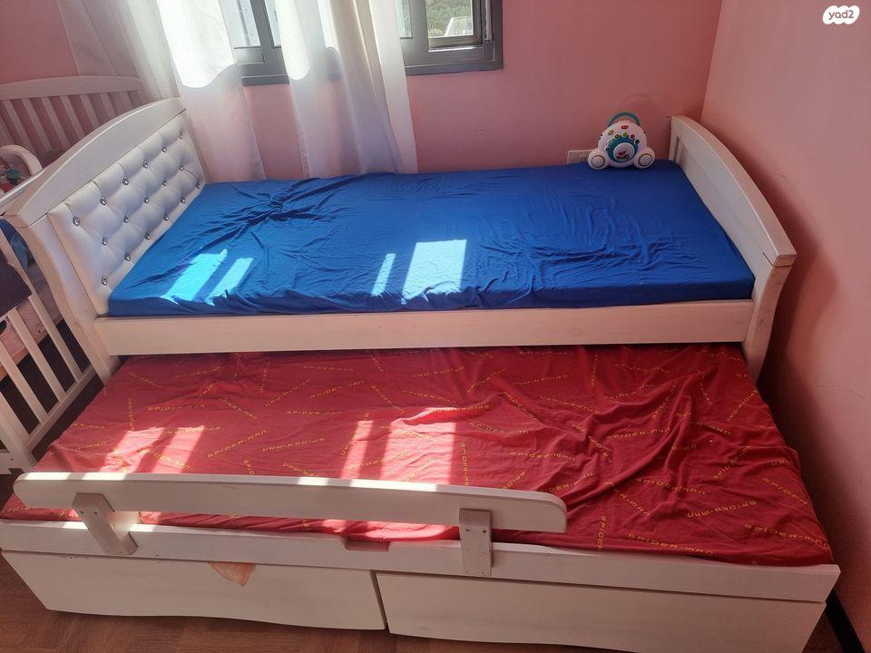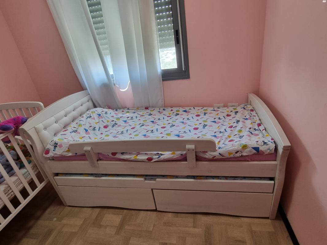 מיטה מבית שמרת הזורע. מיטה עליונה, מיטת חבר נשלפת, 2 מגירות אחסון, 2 מזרנים, ומעקה בטיחות. ראש המיטה מרופד בספוג מצופה בבד דמוי עור משובץ יהלומים. קל לניקוי בסיסי המיטה עשויים מרצועות עץ המאפשרים גמישות ונוחות מגירות המיטה גדולות ועמוקות, נשלפות בקלות ללא צורך בידית המגירות סגורות מאחור, למניעת כניסת אבק ולכלוך (יתרון גדול) מעקה הבטיחות של המיטה נייד ונשלף, ניתן להסרה והחזרה בעת הצורך מיטת ילדים- שמרת הזורע.