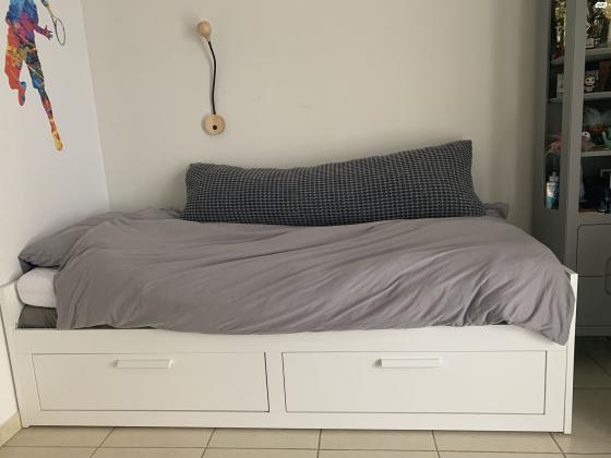 מיטת יחיד נפתחת 80*200 של איקאה.כשפתוחה גובה המיטה אחיד, לכן אפשר להשאיר קבוע במצב פתוח (200*160)המיטה מעולה, שמורה מאוד.כוללת 2 מזרונים כמו חדשים ומגן מזרון לשניהם.הכל נקי, מצוחצח וללא פגמים מיטת איקאה BRIMNES כחדשה!