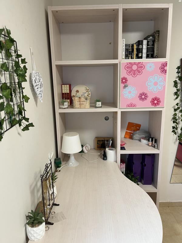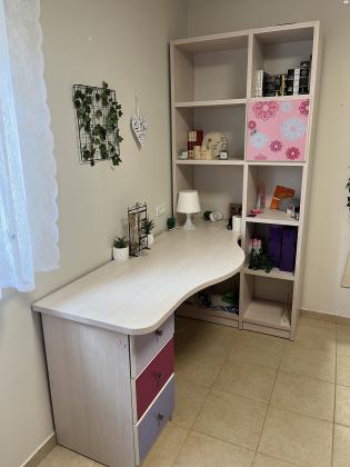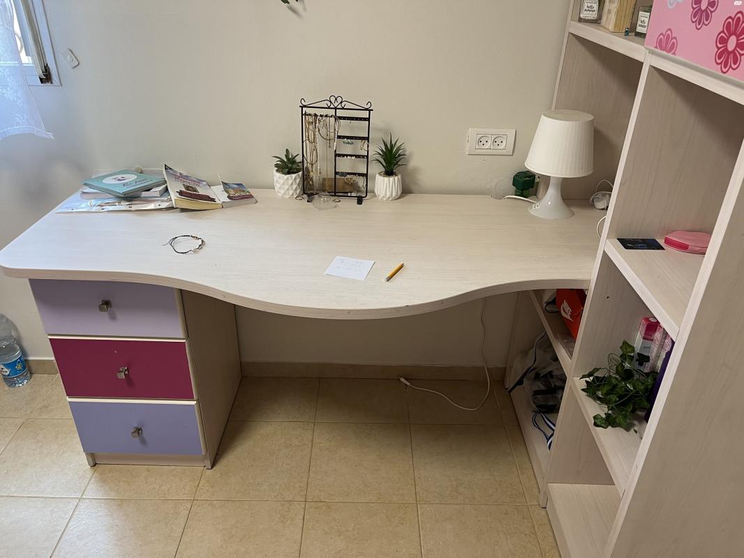 שולחן עם כוננית ו-3 מגירות, במצב מעולה, מידות: גובה 208,רוחב כוננית 96, אורך שולחן 180 שולחן עם כוננית, 3 מגירות
