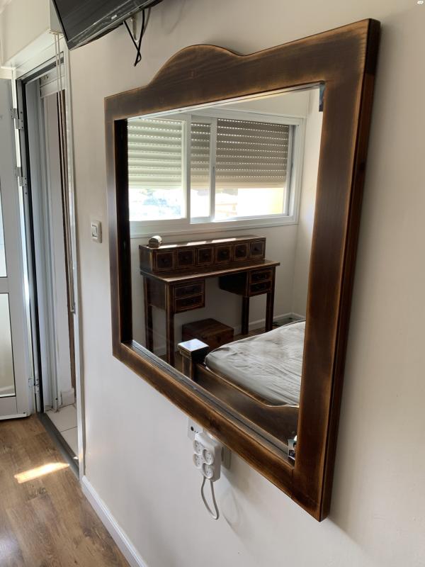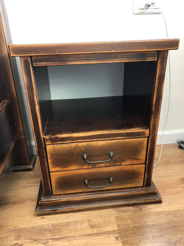 חדר שינה קומפלט עץ מלא מעצב פרטי. פריט אחד וייחודי .גודל מיטה: 2.15x1.77גודל מזרון למיטה: 2.00x1.60 גובה גב מיטה : 1.14גובה קדמי : 63שידת מגירות : 1.20x40. גובה : 98מראה : 100x972שידות לצד המיטה: 50x41. גובה 60המיטה נמכרת ללא מזרון חדר שינה עץ מלא