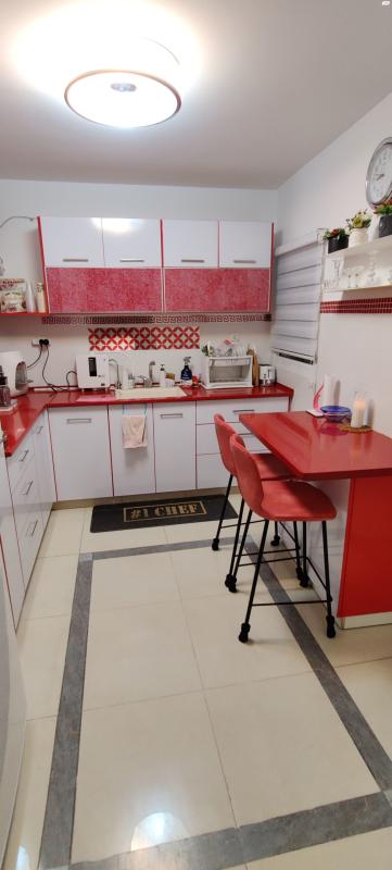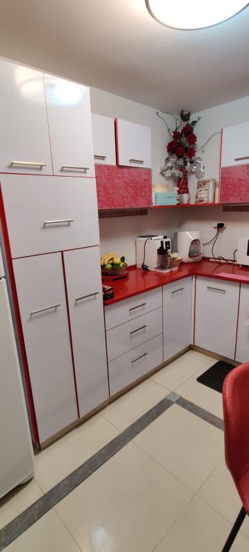 מטבח סנדוויץ אדום-לבן במצב טוב מאוד, 3 קלפות, 90 סנטימטר כל אחת, בערך בגודל 15 מטרים ארונות מטבח אדום-לבן