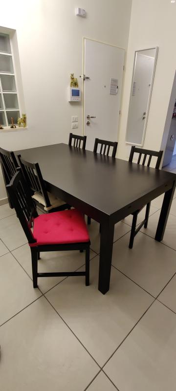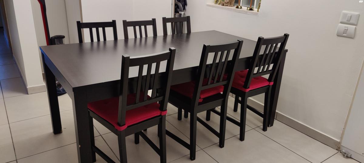 שולחן אוכל נפתח של איקאה + 6 כסאות במצב טוב ויציב. גודל השולחן 150X90 ונפתחו בשני שלבים עד 240 שולחן אוכל נפתח +6 כסאות