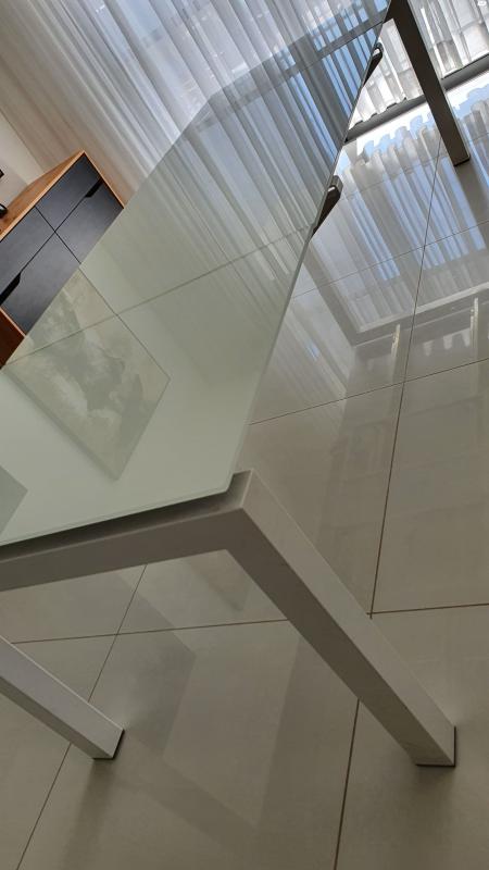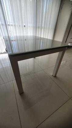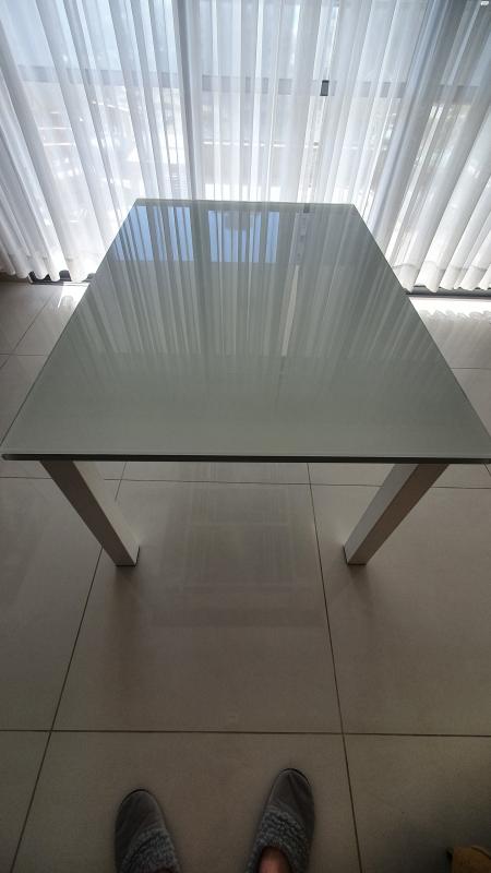 שולחן קליגריס לבן עם זכוכית מחוסמת לבנה, מידות 1.20×90, נפתח ל 2.40×90. מנגנון פתיחה מיוחד. במצב מצוין שולחן זכוכית לבנה calligaris