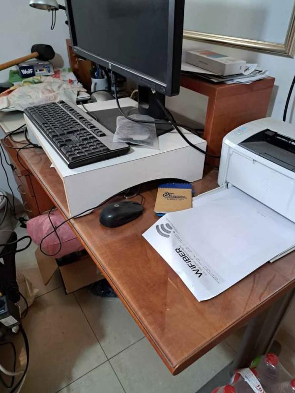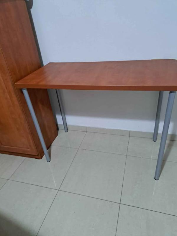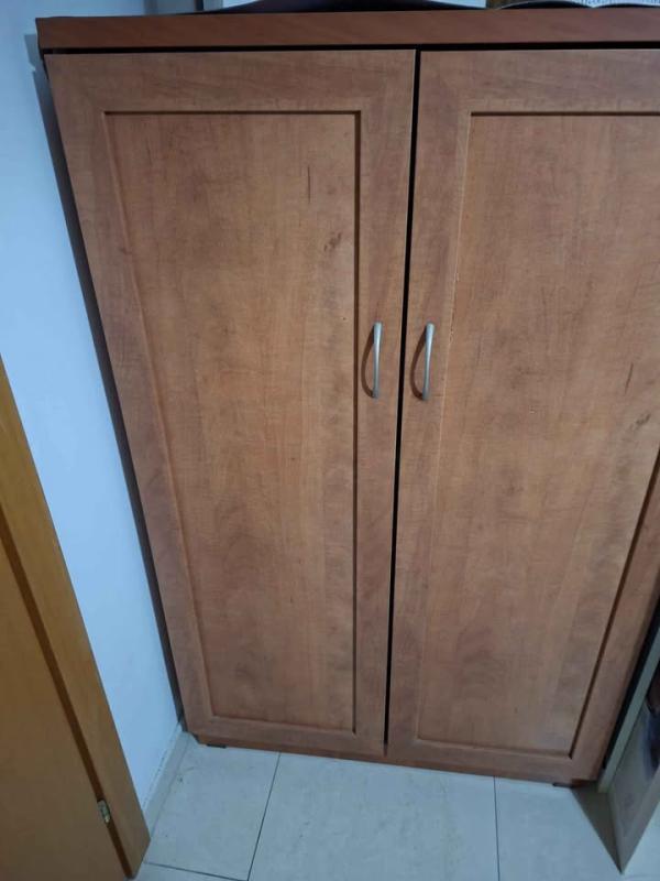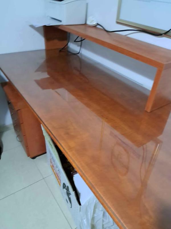 סט ריהוט משרדי במצב כמו חדשכולל שולחן עבודה רחב עם תוספת שולחן צידי שניתן להפרדה ושימוש כשולחן בפני עצמו, ארונית שתי דלתות, שידת מגירות על גלגלים (נכנסת מתחת לשולחן) ומדף קיר לספרים (ניתן לשים גם הפוך על השולחן כמו בתמונות).מידות מלאות באחת התמונות
