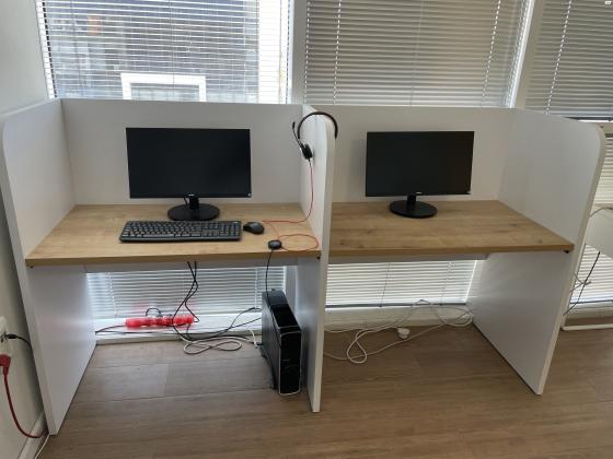 2 עמדות טלמרקטינג מחוברות - סה״כ 4 מקומות.פינות עגולות מידות שולחן 100/60.עמדות כמו חדשות נקנו לפני כמה חודשים כמעט ולא נעשה בהם שימוש עמדות טלמרקטינג