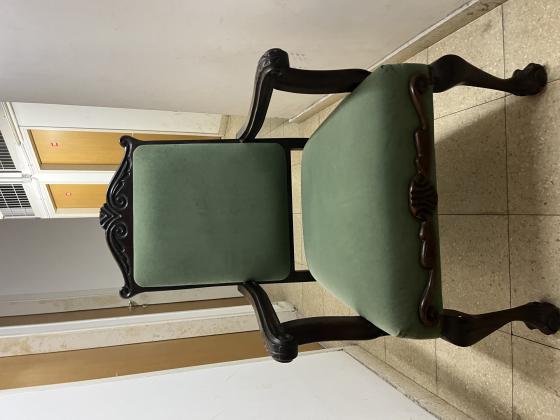 כורסא ירוקה עם פיתוחי עץ מעץ מלא