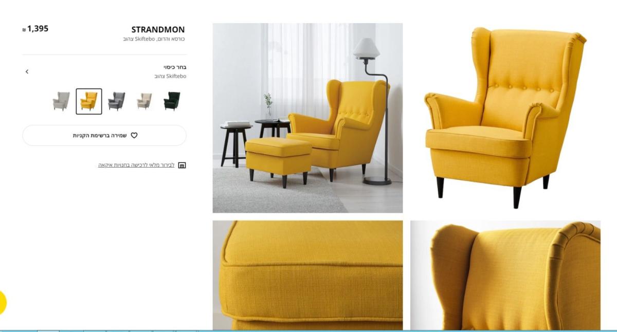כורסה של איקאה במצב מעולה ושמורנמכרת באיקאה ב-1,395 ש״ח עם ריפודים שונים (הריפוד הפרחוני כבר לא קיים) כורסא והדום איקאה