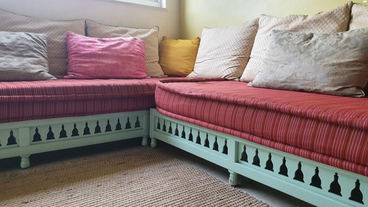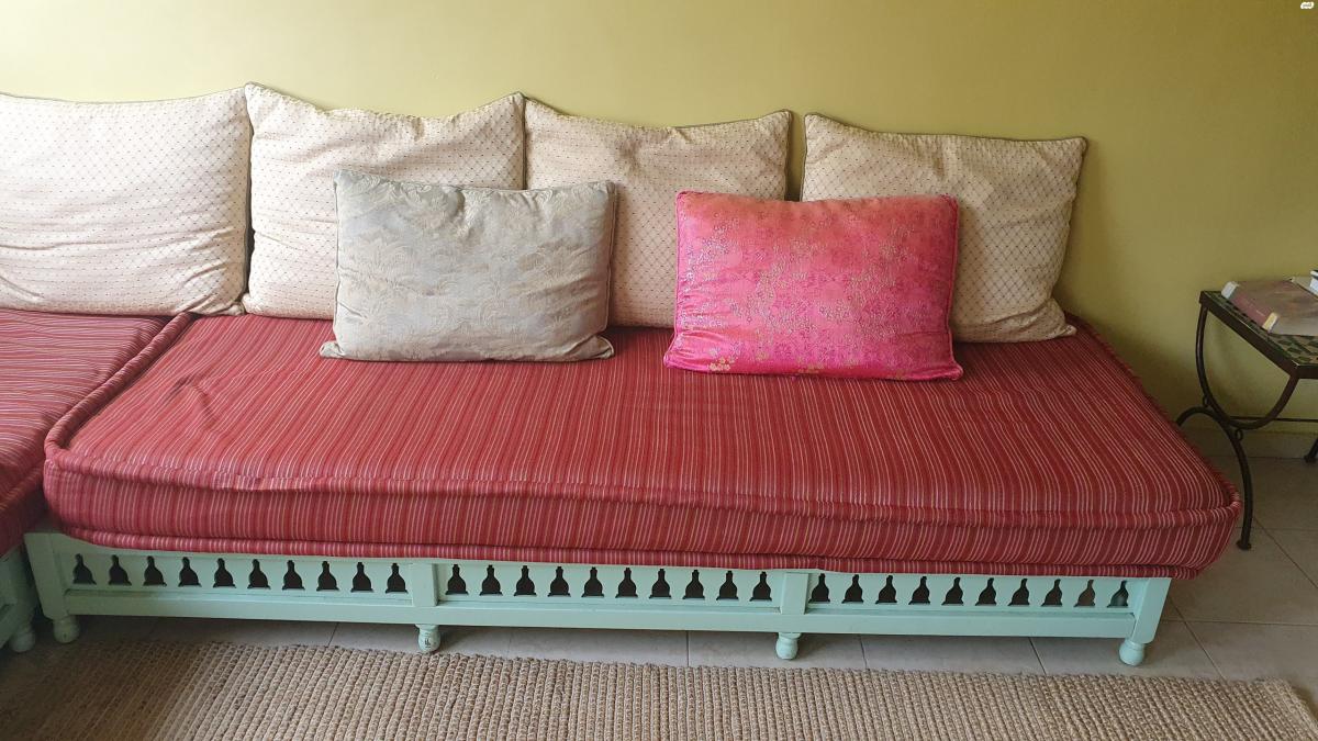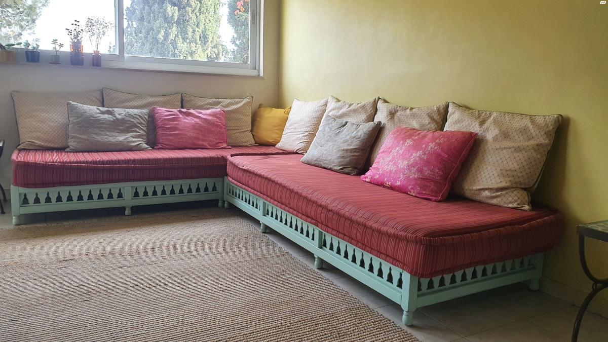 סלון מרוקאי בעיצוב אישי.2 ספות באורך 2 מטר כל אחת.ללא גב (חייב להשען על קיר).בסיס עץ מעוצב צבוע.עומק 80 ס"מ סלון מרוקאי יפיפה. בעיצוב אישי
