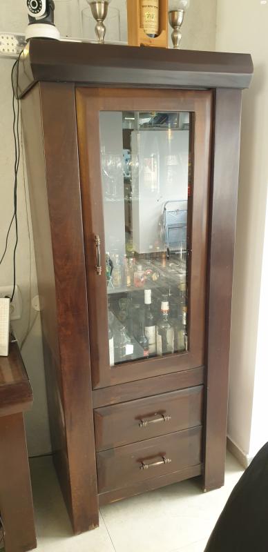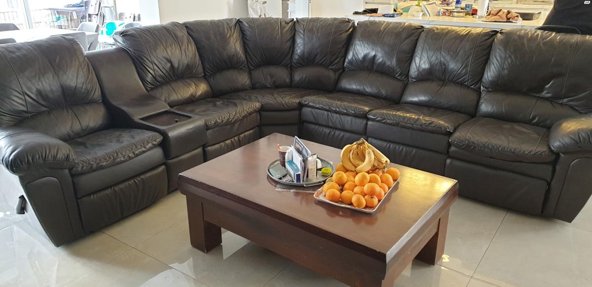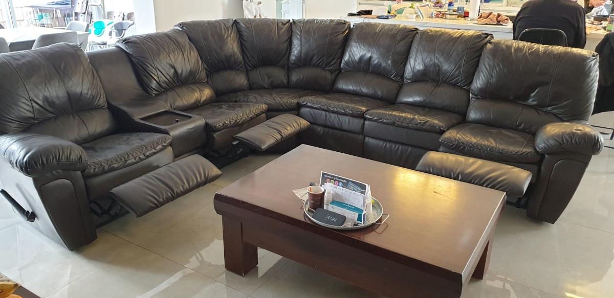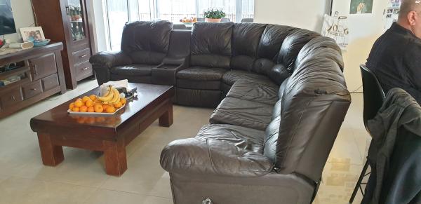 סלון פינתי איכותי, מעור איטלקי בצבע חום, תוצרת חוץ חברת רלגסון. שלושה מושבים ניפתחים למצב שכיבה עם משען רגליים. תא איחסון משולב.מזנון 2 מטר+ וטרינה תואמת , שולחן עץ עם מגירה תואם 120X78 ס"מ בצבע חום ספות+שולחן+וטרינה+מזנון