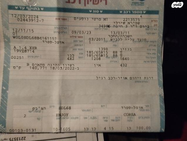 אופל קורסה Enjoy אוט' 5 דל' 1.4 (100 כ"ס) [2010-2015] בנזין 2011 למכירה בחיפה