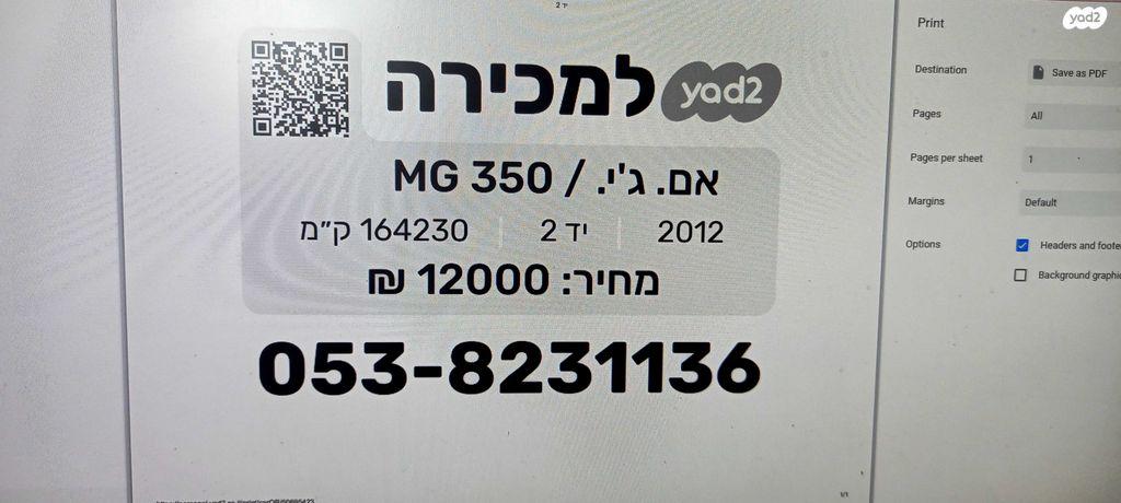 אם. ג'י. / MG 350 De Luxe אוט' 1.5 (105 כ"ס) בנזין 2012 למכירה בראשון לציון