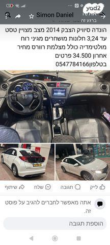 הונדה סיוויק הצבק 2014 מצב מצויין טסט עד 3,24 חלונות מושחרים מגיני רוח מולטימדיה כולל מצלמת רוורס