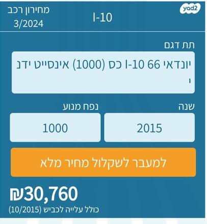 יונדאי i10 Insight ידני 1.0 (66 כ"ס) בנזין 2015 למכירה בראשון לציון