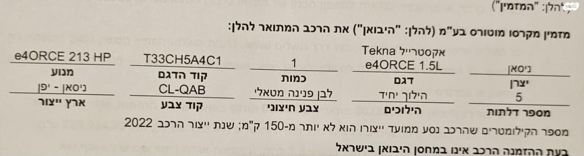 רכב בבעלות של חבר שלי מפרסם בשבילו! רכב חדש שכמעט לא נסע בכלל! אין לו אפשרות לשלם עליו אז הוא מוכר מכירה מעל המחירון למי שרוצה לקבל רכב כאן ועכשיו ג'יפ ברמה גבוה מאוד של ניסאן לא בשבת! מחיר 355,000 ש"ח לרצינים בלבד ! לא לחייג סתם תודה