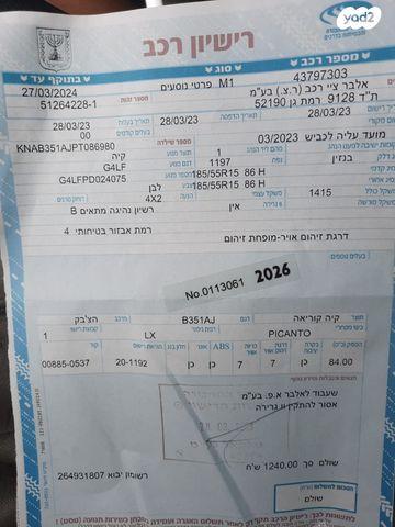 קיה פיקנטו LX אוט' 1.2 (84 כ"ס) בנזין 2023 למכירה בפתח תקווה