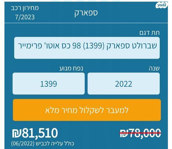 שברולט ספארק Premier אוט' 1.4 (98 כ''ס) בנזין 2022 למכירה ברחובות