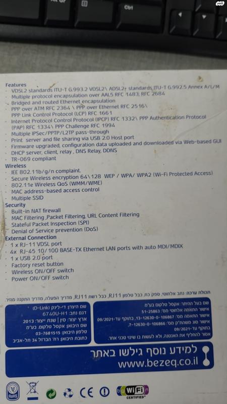 רואטור תוצרת D -LINK שסופק על ידי בזק אך לעולם לא נעשה בו שימוש מתאיםדגם D-link vdsl n 6740U-h1 D-link vdsl n 6740U ראוטר WIFI