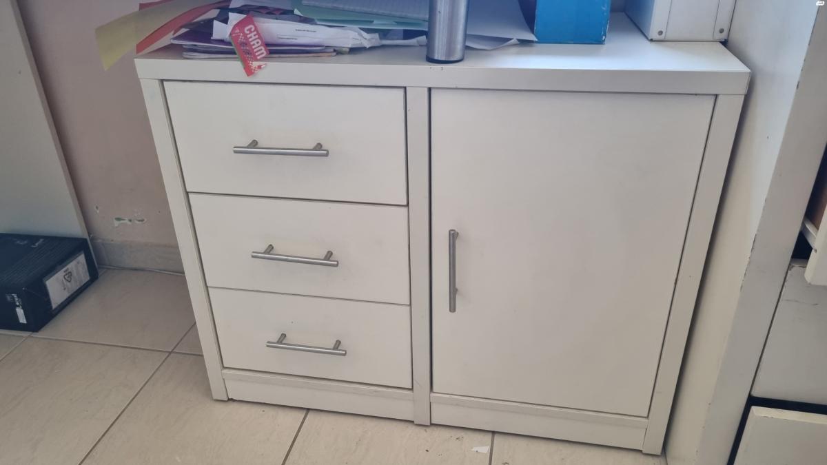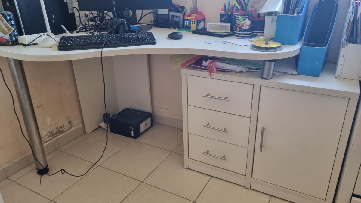 שולחן כתיבה/ מחשב פינתי של רהיטי דורון בצבע שמנת וארונית גדולה. 94×1.45. ארונית 79×40 שולחן כתיבה