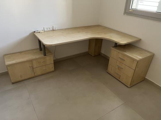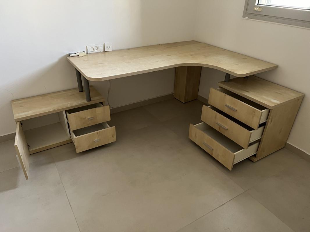 סט מלא: שולחן כתיבה משרדי פינתי פלוס 2 שידות מגירות פלוס ארונית תליה מעל השולחן לספרים. הכל במצב מעולה, שמור מאוד.הוכן בהתאמה אישית עי נגר פרטי !!! שולחן כתיבה כולל 2 שדות מגירות