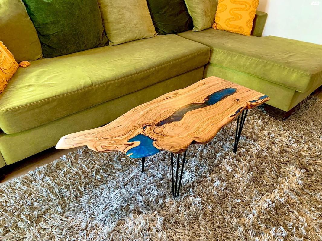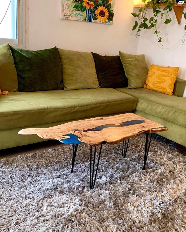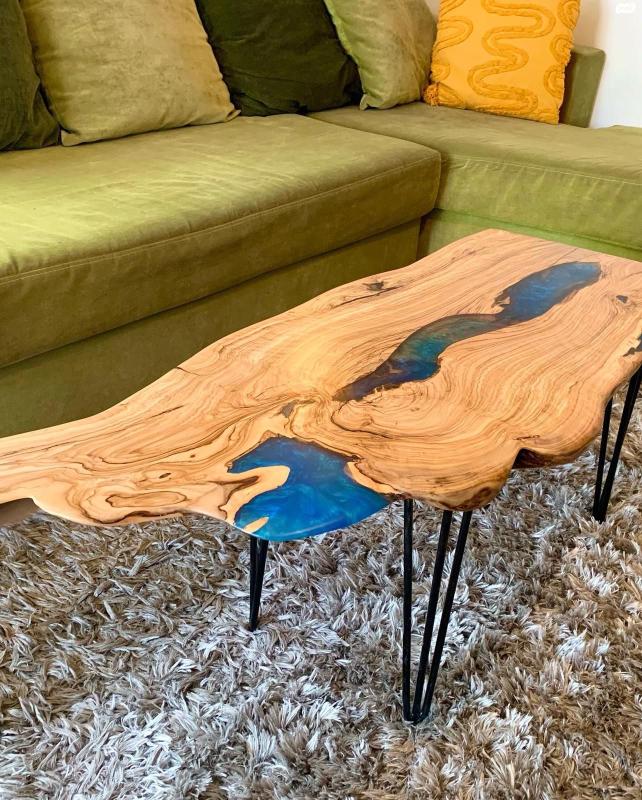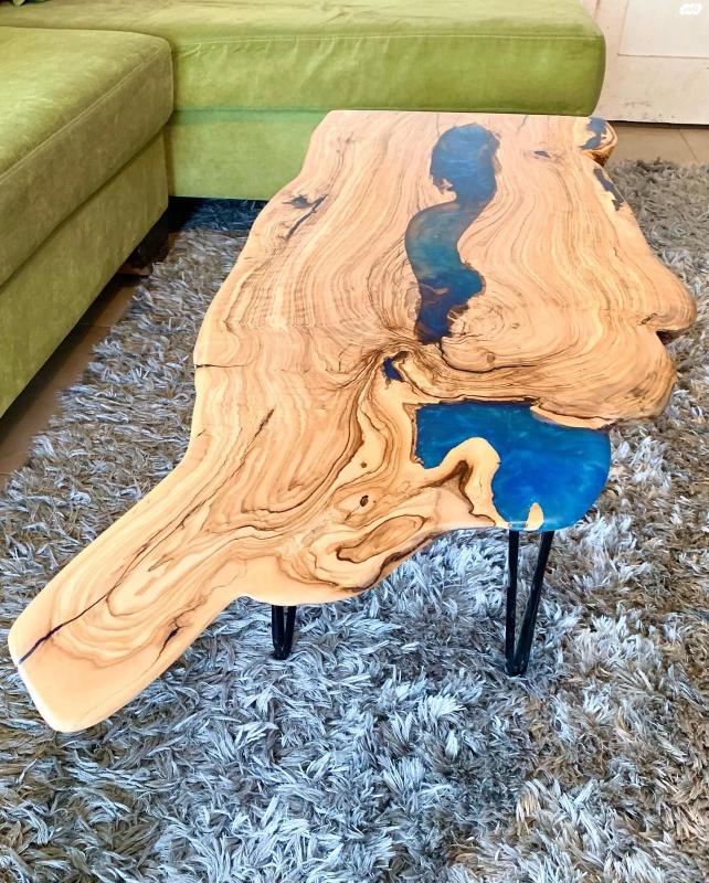 שולחן סלון מהמם מעץ זית עם אפוקסי כחול במספר גווניםרגלי סיכה מברזלגודל 1.10 מ' אורך , 45 ס"מ רוחב בחלק הכי רחבשולחן שנבנה בהזמנה אישית שולחן סלון מעץ זית