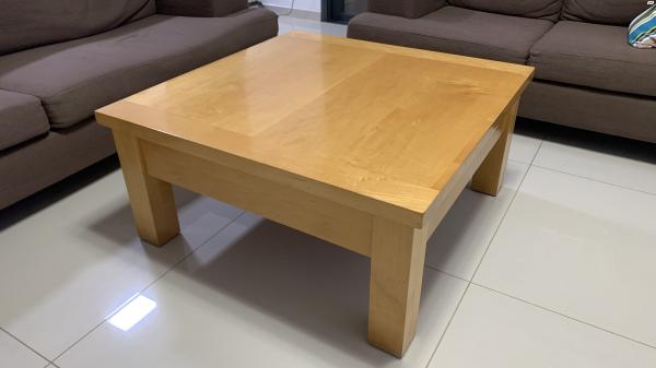 שולחן סלון מעץ מלא,מידות 100*100.בנוסף:פינת אוכל מעץ מלא תואמת, שולחן + 6 כסאות,מידות 100*180 + 2 הארכות של חצי מטר כ״א, 1,200₪.סלון תואם של ביתילי בצבע חום 3+2, 2,200₪ שולחן סלון מעץ מלא