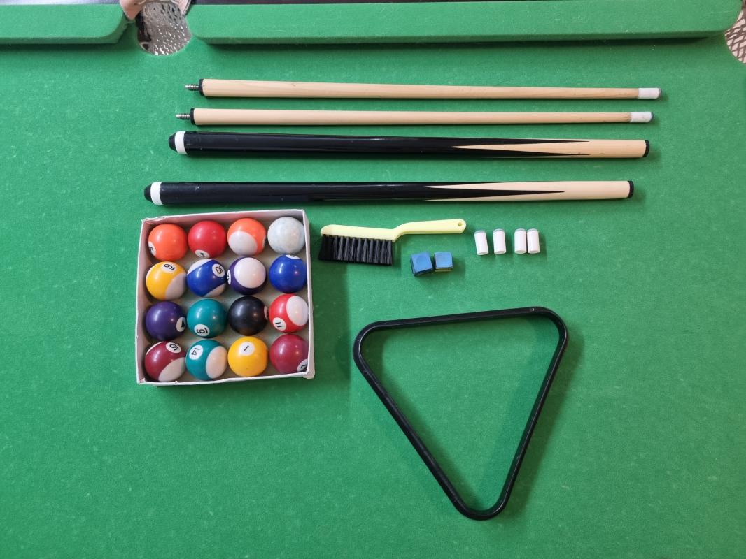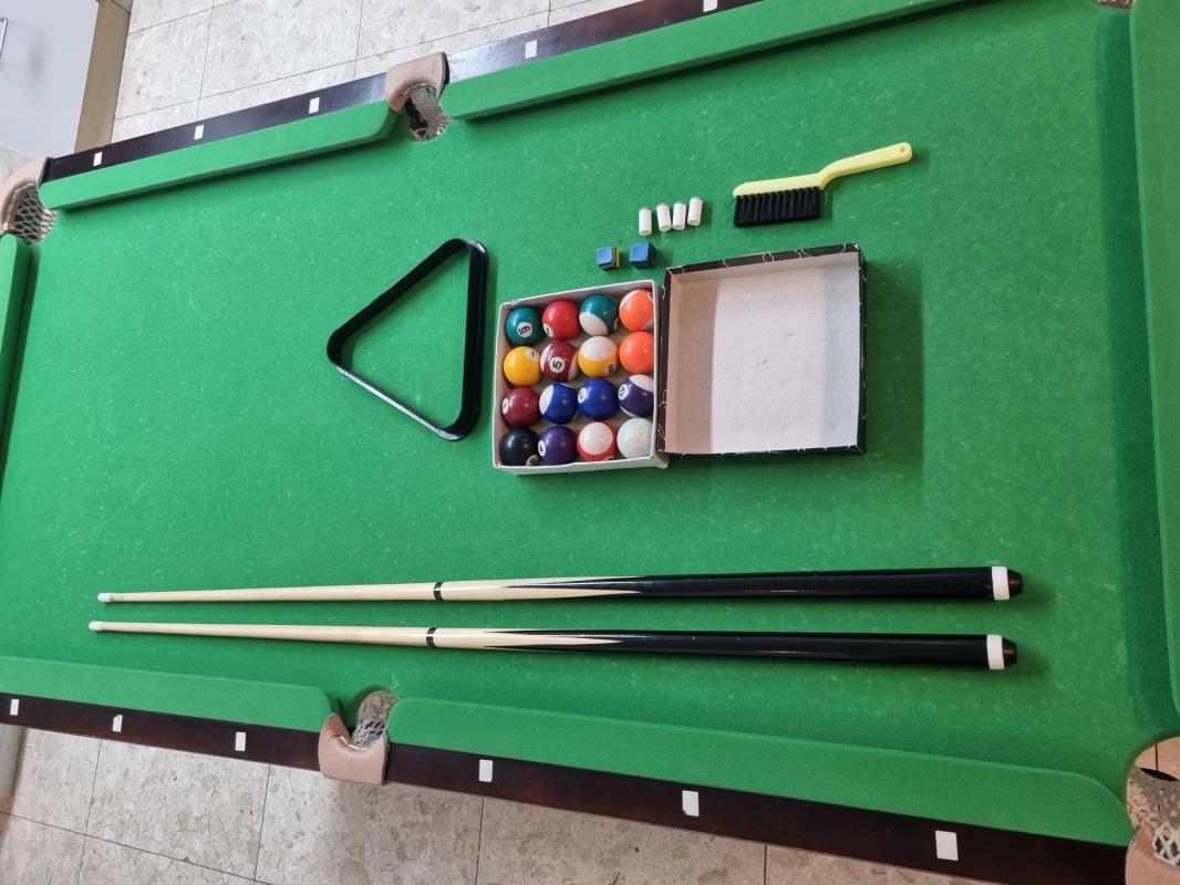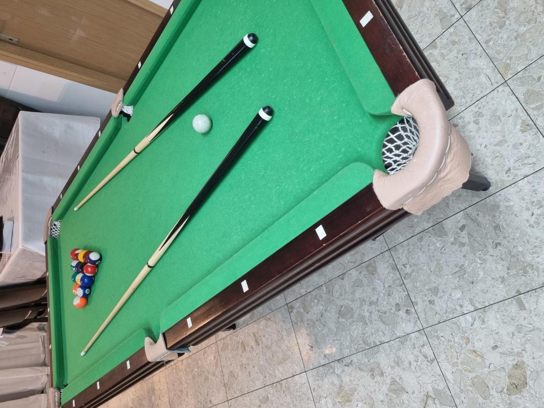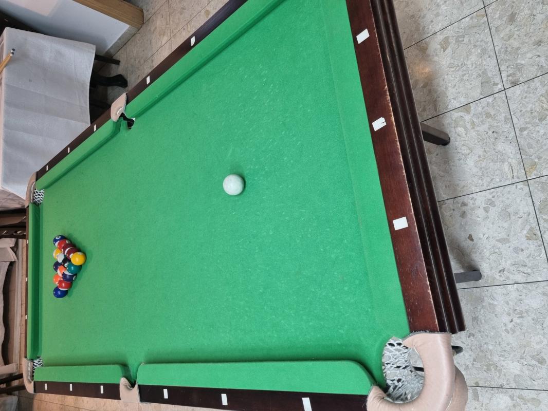שולחן סנוקר 6 פיט Superleague Diamondמצב מעולה שמור היה בשימוש ביתי זמן קצר נמכר עקב מעבר לשולחן גדול יותר מגיע ביחד עם: שתי מקלות ביליארד, משולש לכדורים, סט כדורי ביליארד מלא, ארבעה ראשים מתלבשים למקלות, שני גירים, מברשת לניקוי הבד.