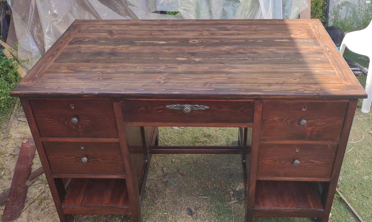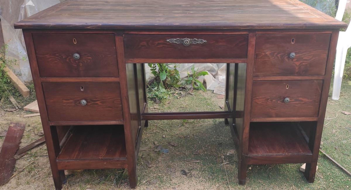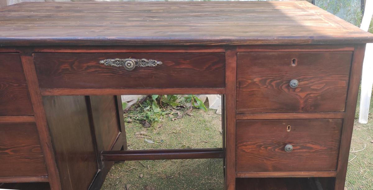 שולחן עבודה וינטג' עבודת יד מעץ מלא, המון מקום אחסון (מגירות עמוקות), במצב מצויין.130 ס"מ אורך, 77 ס"מ עומק, 80 ס"מ גובה שולחן עבודה עץ מלא וינטג'
