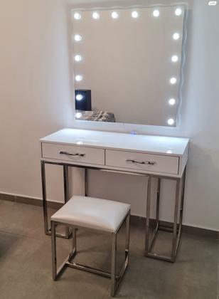 השידה נקנתה מליאו עיצובים- שידות איפור בראשון לציון (leodesingsil47) מדגם מילאנו השידה עם שתי מגירות כסא ומראה עם אורות גודל השידה: רוחב: 100 ס*מ , עומק 40 ס*מ , גובה 75 ס*מ מידות המראה: 80 / 80 ס*מ שידת איפור + כסא + מראה עם אור