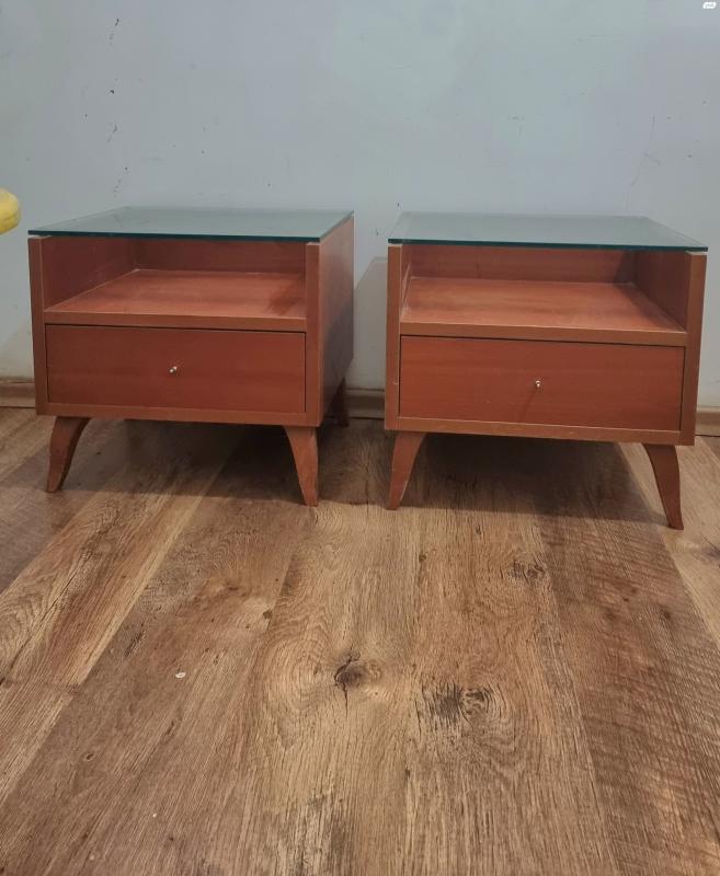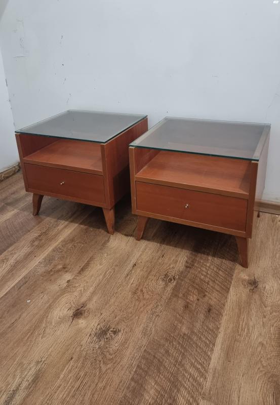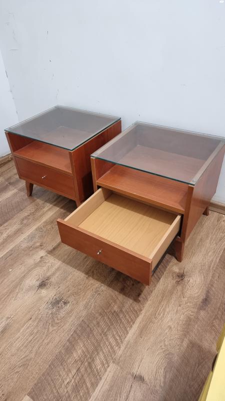 זוג שידות צד וינטג איכותיות עץ בשילוב זכוכית , נוחות מאוד, במצב מצויין שידות עץ וזכוכית