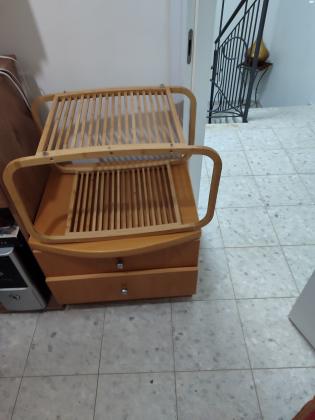 מעמד לטלוויזיה מעץ עם שתי מגרות ניפתחות לאיחסון דברים ושולחן תואם (השולחן יכול להיות מונח במצב מאוזן או במצב מאונך). המעמד והשולחן במצב טוב מאוד. ניתן לקנות רק חלק מהפריטים. מחירו של כל פריט 100 שח מעמד לטלוויזיה ושולחן תואם.