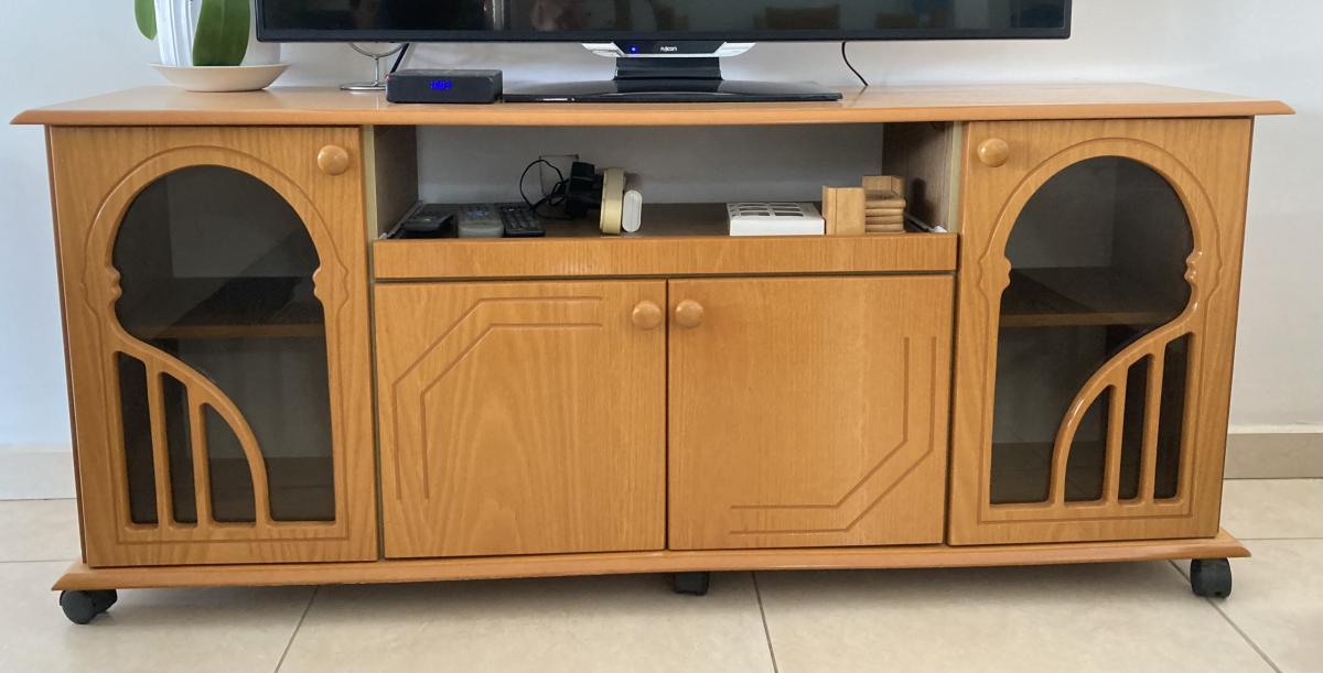 שידת טלויזיה עם גלגלים, במצב טוב, אורך 120 ס"מ, עומק 60 ס"מ, גובה 74 ס"מ. יש מעלית, נא לפנות דרך האתר ולא להתקשר