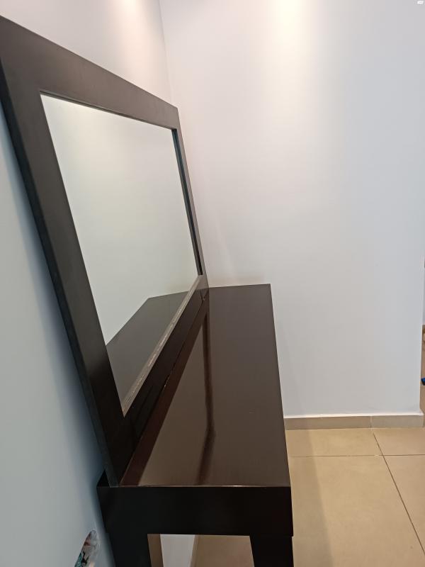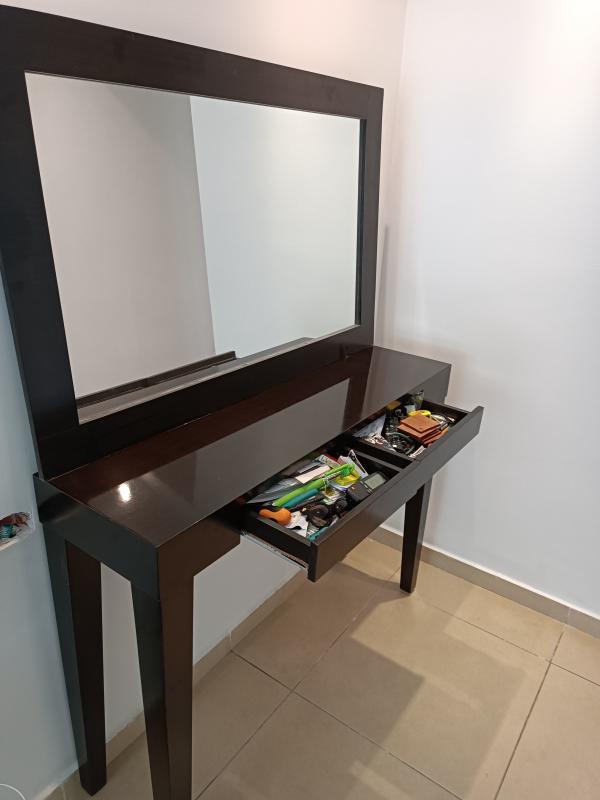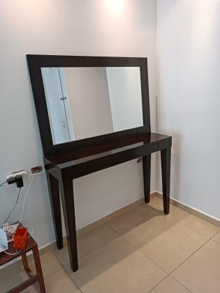 שידת קומודה מעוצבת שמתאימה לכניסה לבית בצבע ונגה עם מראה תואמת (המראה צולמה שהיא לא במצב תלוי עקב שיפוצים שנעשים בדירה, אך בפועל היא אמורה להיות תלויה על הקיר), עם 2 מגירות אינטגרליות. מידות 1.30, עומק 35במצב חדש לגמרי! שידת קומודה במצב חדש!