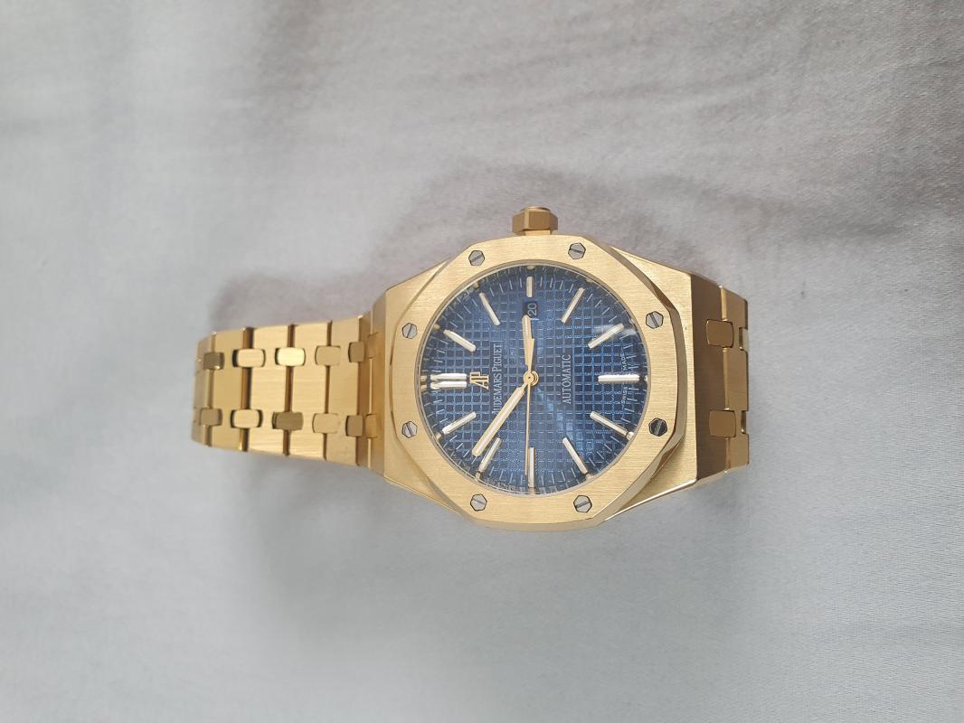 שעון ap רצועה בצבע זהב ולוח בצבע כחולמנגנון אוטומטי
