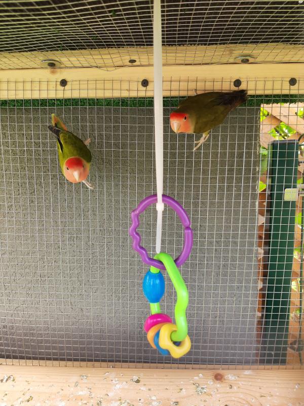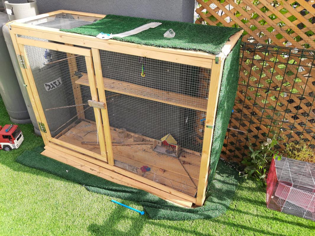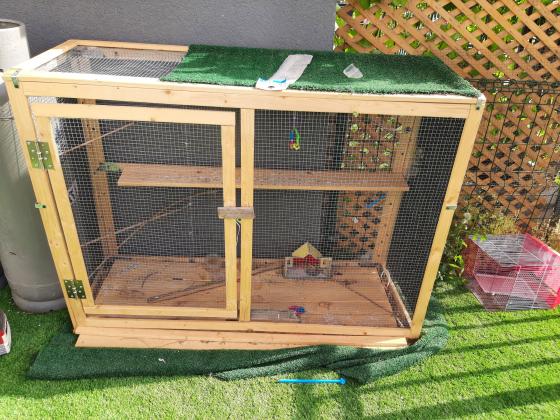זוג ציפורי אהבה + כלוב תעופה במידות אורך 1.5 מטר, רוחב 0.5 מטר וגובה 1.1 מטר כולל דלת + 2 מתקני האכלה