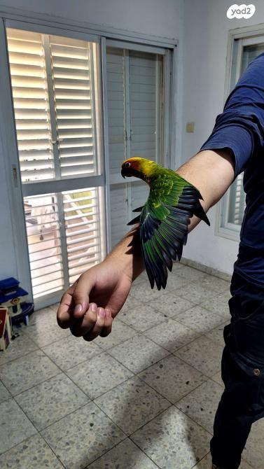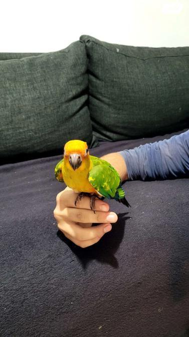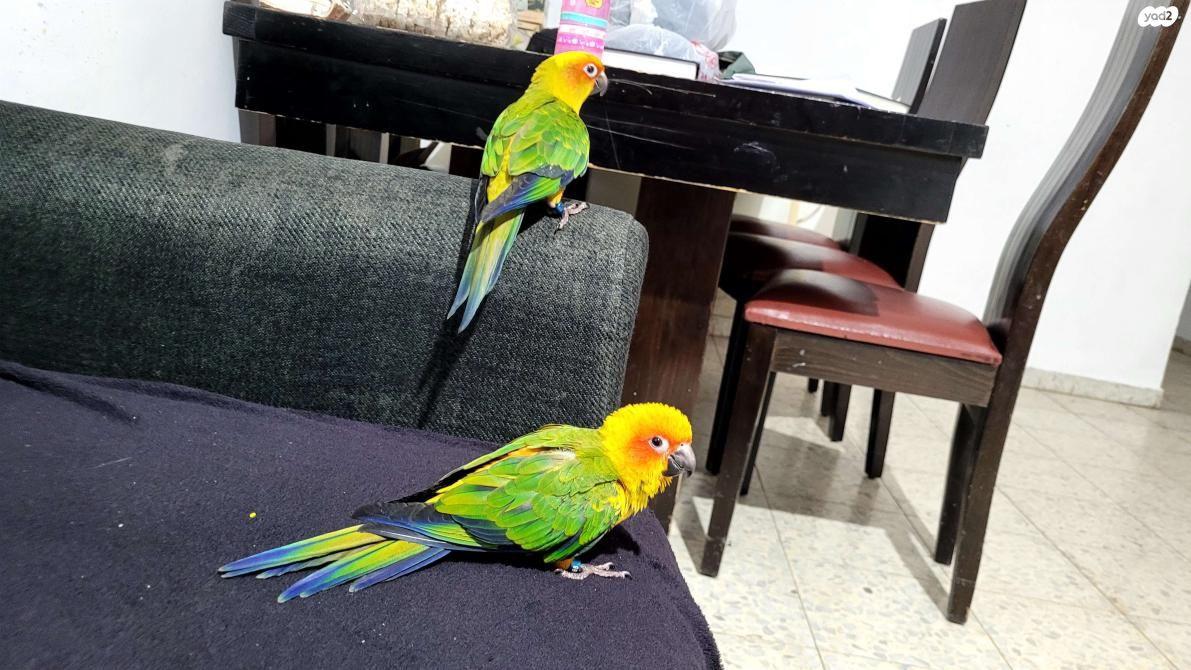 קוניור שמש שני גוזלים בני 3 חודשים האכלת יד ברמה גבוהה אחד מגוזלים בסוף שלבי גמילה + כלוב למי שרוצה