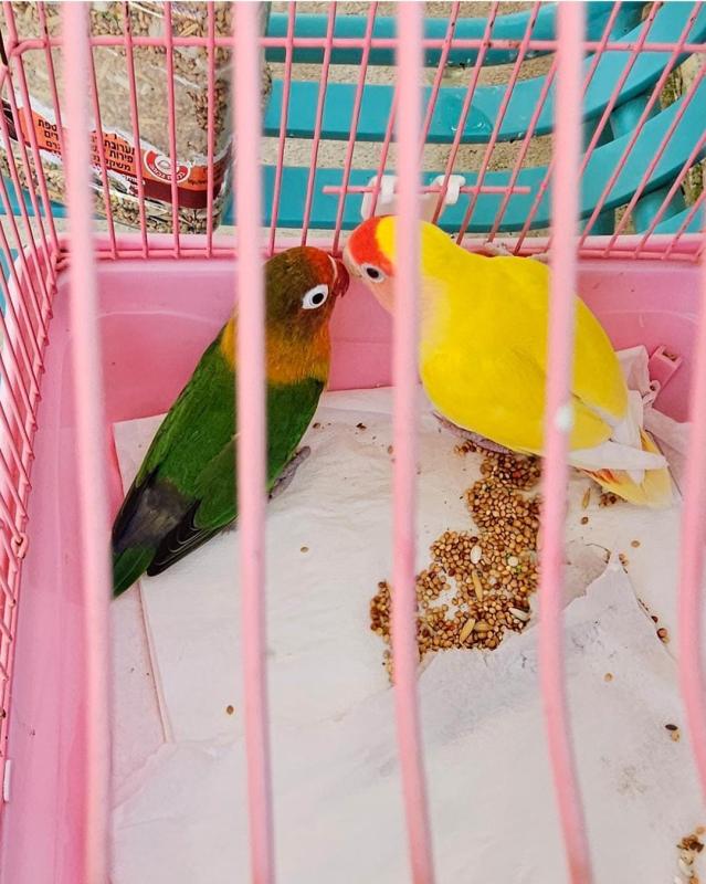 שתי ציפורי אהבה, כנראה נקבות, מפינת חי טיפולית בפיקוח וטרינרי