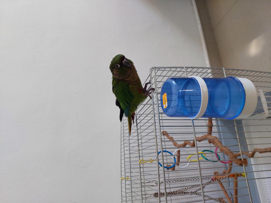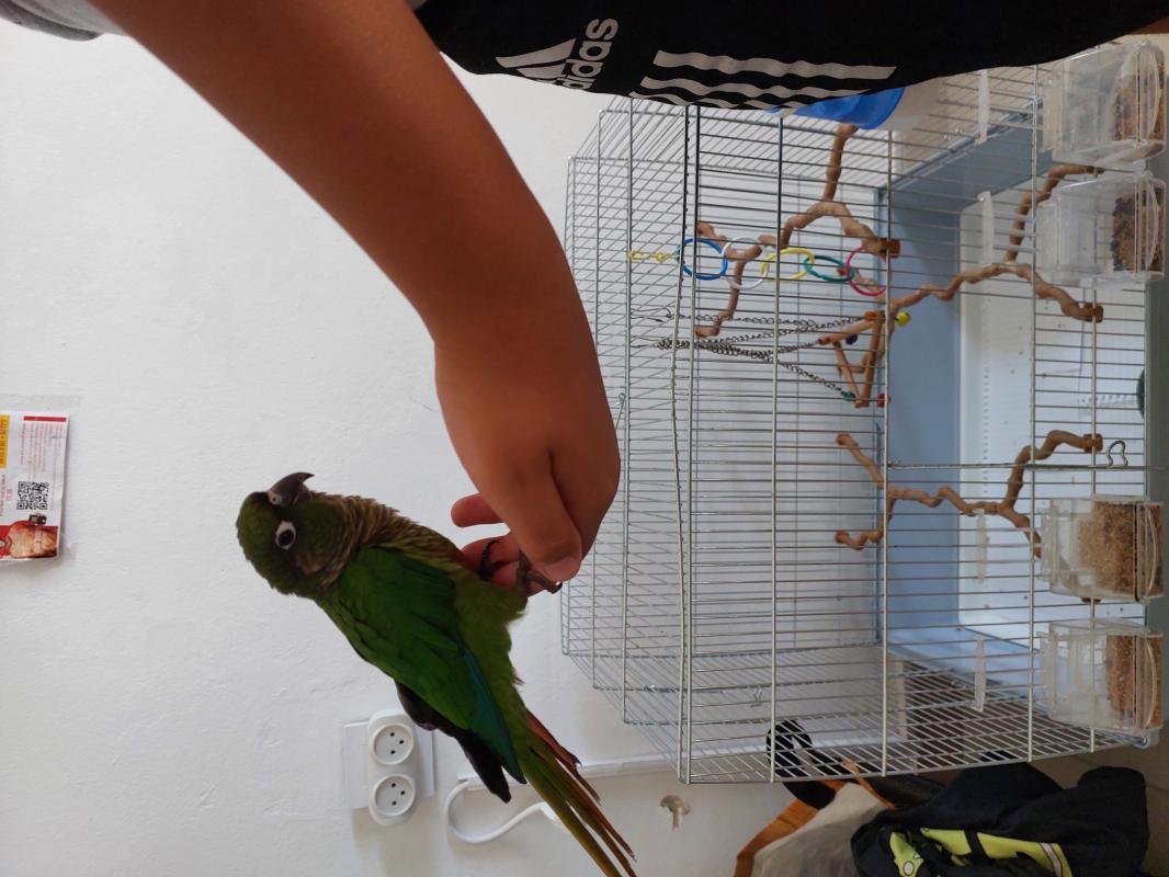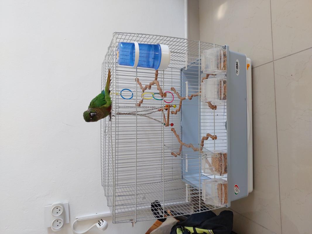 תוכי גרינצ'יק ירוק האכלת יד כולל כלוב ושק מלא של אוכל.