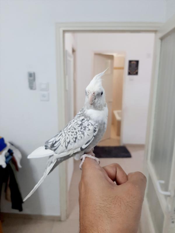 תוכי מסוג קוקטייל ,יפיוף צבע מעורב לבן ואפור, האכלת יד כמובן לא נושך .