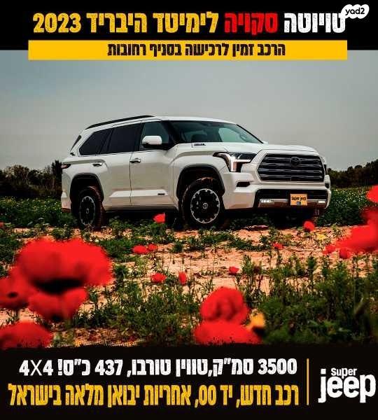 טויוטה סקויה לימיטיד 2023, צבע לבן פנינה, היברידי טווין טורבו, 3.5 ליטר, 437 כ"ס! 4X4 אוט 10 הילוכים, 8 מקומות ישיבה, ריפודי סופטקס משולב, חבילות- גרירה, , בטיחות סייפטי סנס 2.5+סטאר סייפטי ובליינד ספוט , מולטימדיה 14 אינץ, 8 רמקולים מגבר וסאב, תאורת לד, כסאות מתקפלים חשמלי, חימום בכיסאות קדמיים+הגה,, סאן רוף, אחריות מלאה בישראל
