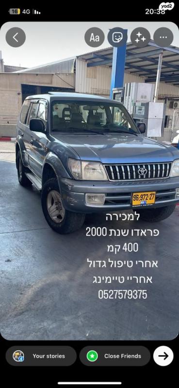 טויוטה פראדו ארוך שנת 2000 הכי שמורה שיש 400000 קמ אחרי טיפול גדול כולל טיימיניג יד 05 כל האוטו שמור בפנים בחוץ דגם מפואר ! אין תקלות הכול מושקע עד הבורג האחרון לא נסע בשטח