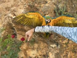 תוכי דררה לא נושך האכלת יד עם כתר בצוואר